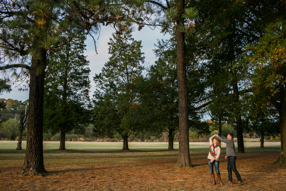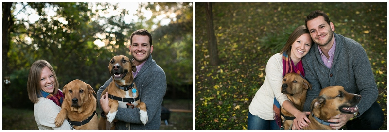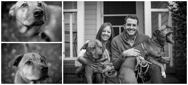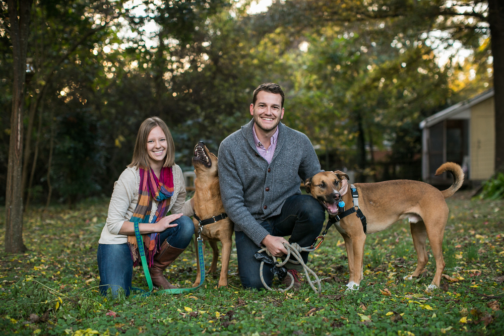 Kim + David’s engagement session took place during the peak of fall in Durham, North Carolina. I had so much fun photographing this playful couple as they threw colorful yellow leaves into the air and frolicked outside at West Point on the Eno and later in the Watts-Hillandale neighborhood. We ended the shoot in Kim + David’s backyard with their rambunctious yet adorable pups for a family photo.