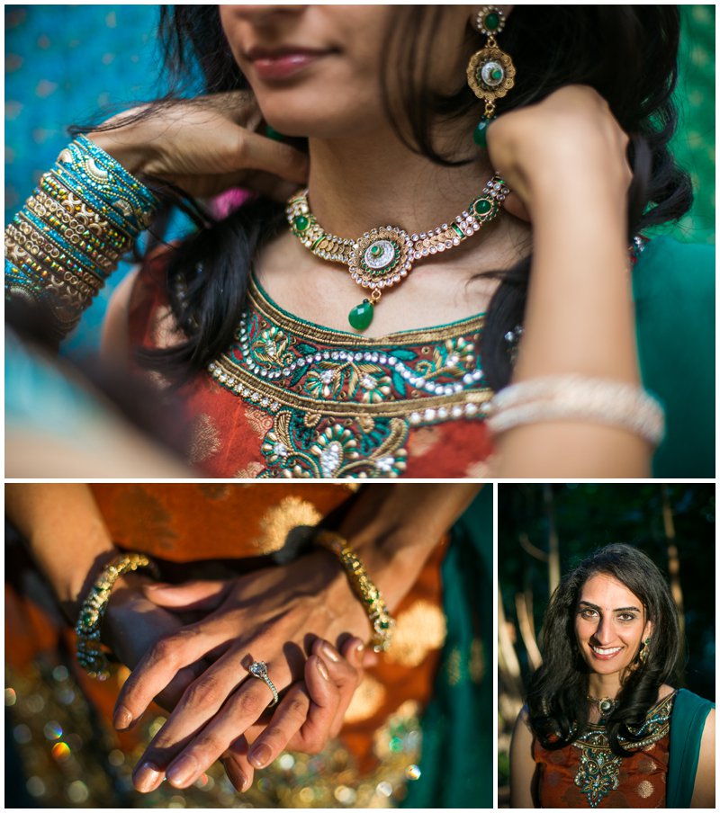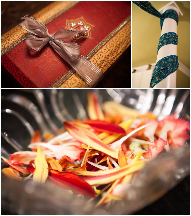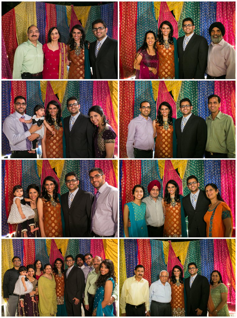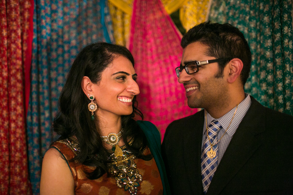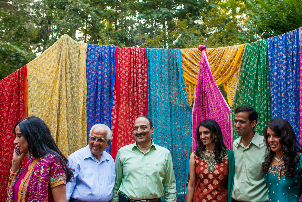 Traditionally, the engagement ceremony is one of the first ceremonies that takes place between the two families of the bride and groom. Unlike my own engagement celebration- which consisted solely of changing my Facebook status and counting the “likes”- Puja and Rajpaul’s event included a limo, delicious food, and the exchanging of gifts and sweets in a forty-five minute ceremony and was followed by dinner. Puja’s family beautifully decorated her family’s home with colorful scarves and flowers which made for a great portrait backdrop!