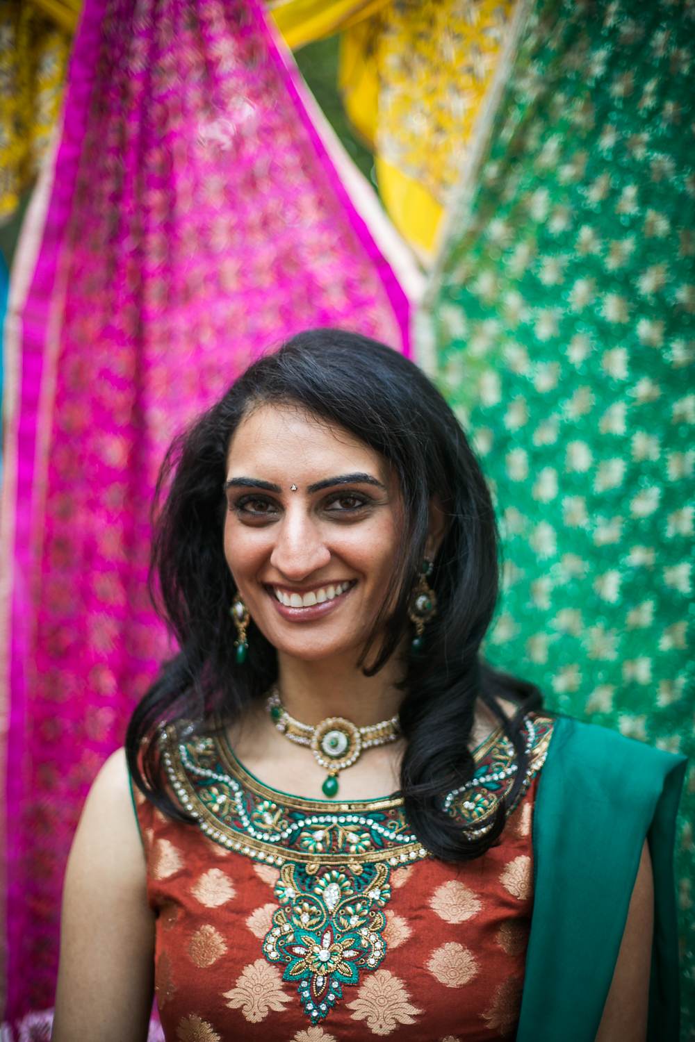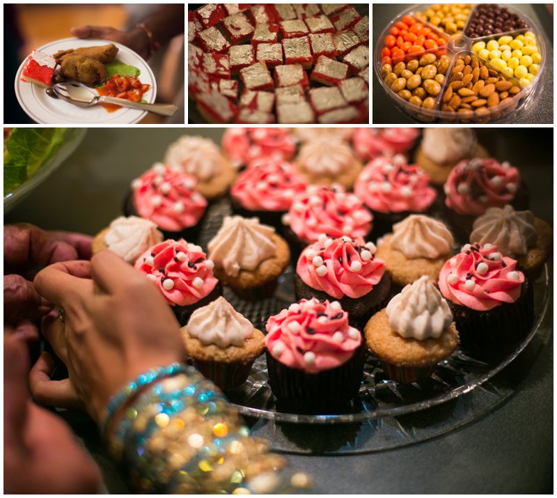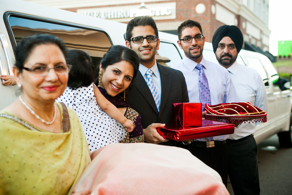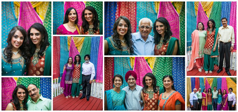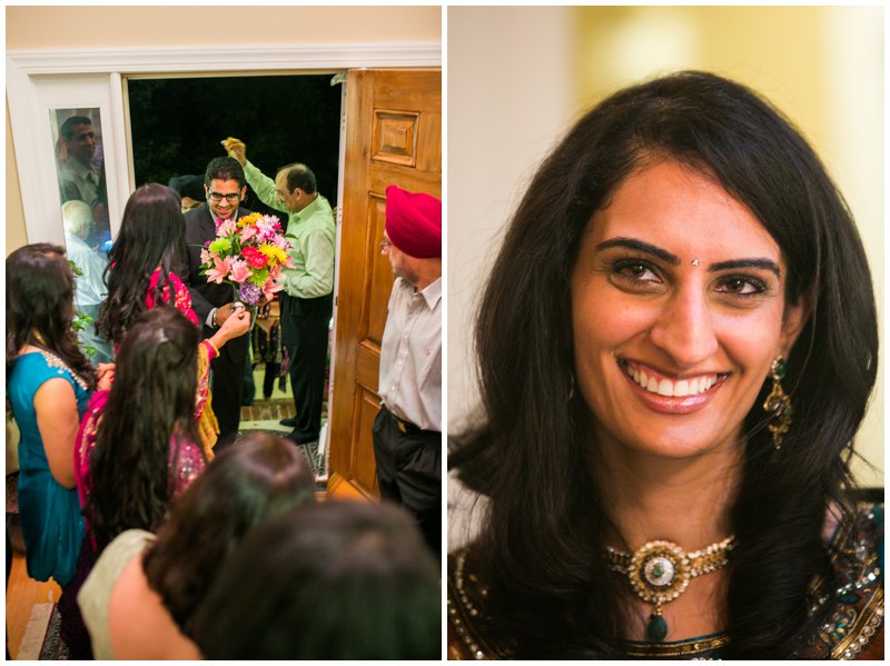Traditionally, the engagement ceremony is one of the first ceremonies that takes place between the two families of the bride and groom. Unlike my own engagement celebration- which consisted solely of changing my Facebook status and counting the “likes”- Puja and Rajpaul’s event included a limo, delicious food, and the exchanging of gifts and sweets in a forty-five minute ceremony and was followed by dinner. Puja’s family beautifully decorated her family’s home with colorful scarves and flowers which made for a great portrait backdrop!