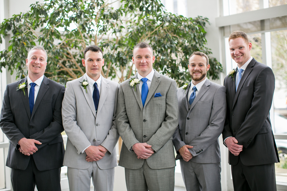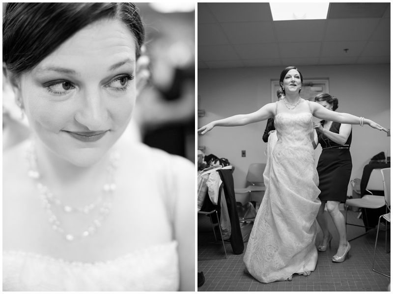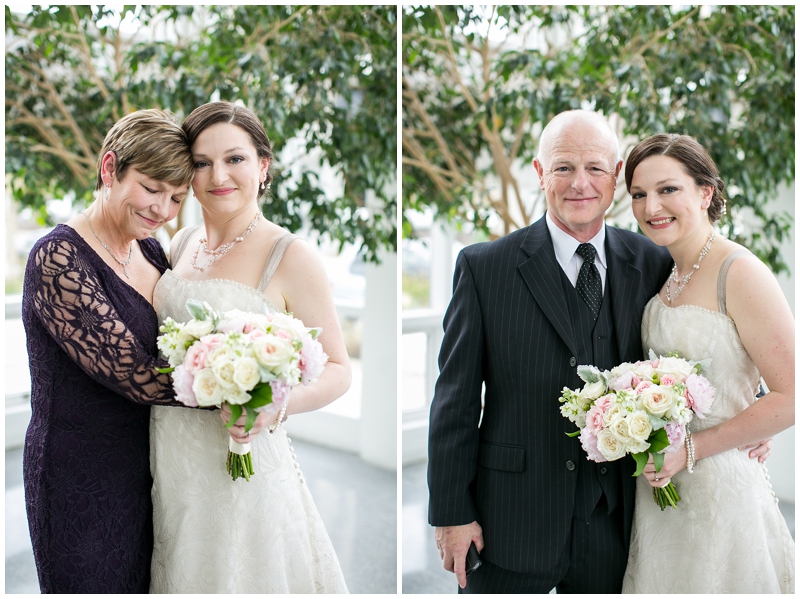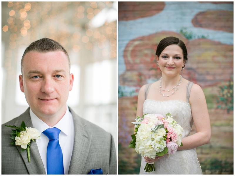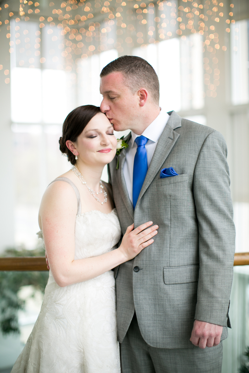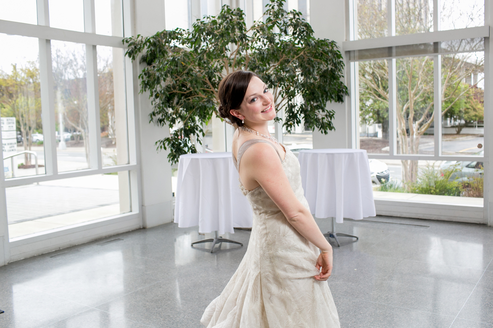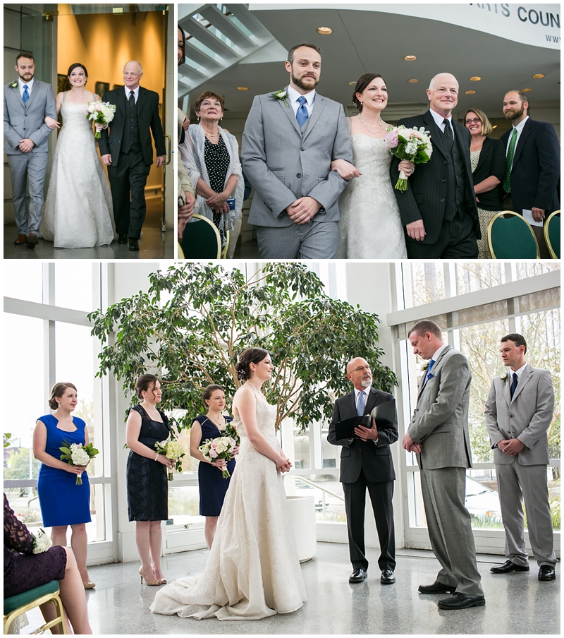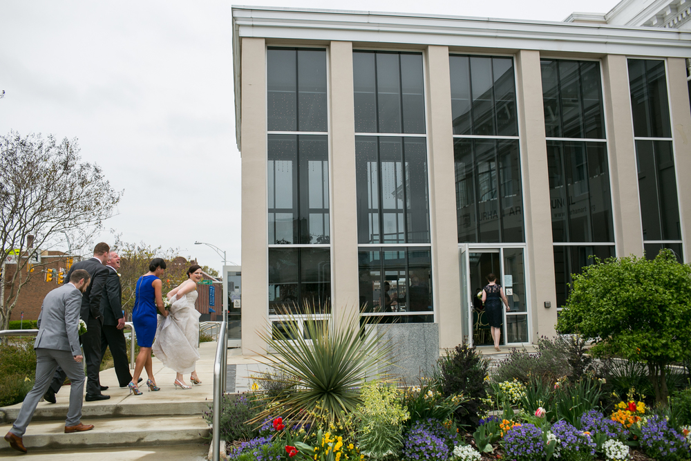 Katy and Pat tied the knot in downtown Durham on April 19, 2014 at the Durham Arts Council. This venue is one of my favorites, and not just because it’s three miles from my house. The massive windows encasing the first floor atrium makes for soft, beautiful light- especially on a cloudy day. The stairs leading up to the second floor make for the perfect spot to capture a bird’s-eye view of the scene, and the twinkle lights hanging from the ceiling create a romantic ambience that calls for minimal decorations.