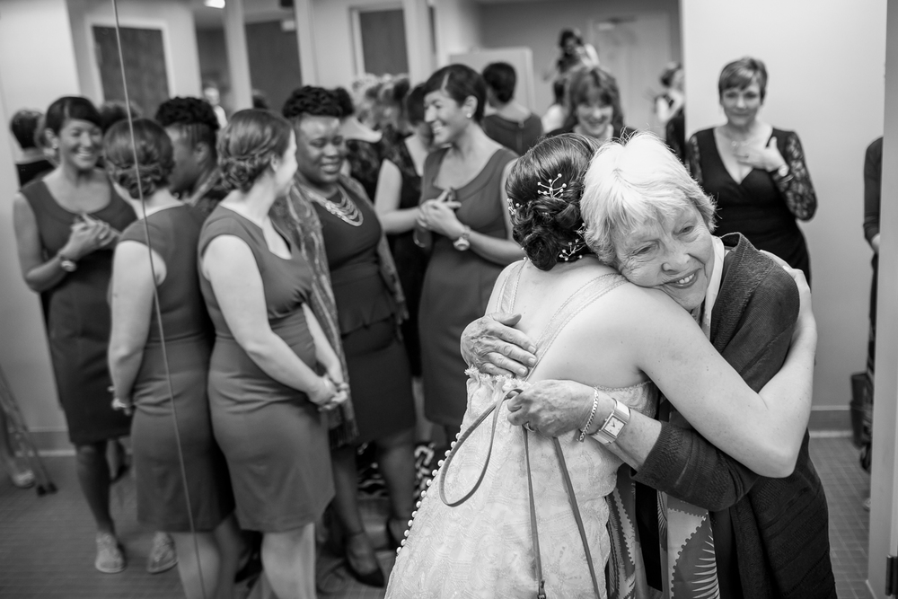 Speaking of family, Katy’s bond with her grandmother was one of the sweetest I’ve ever seen. Katy told me her grandmother Penny is the reason why they chose the Durham Arts Council as their wedding venue. When they saw the wall adjacent to the parking lot that says “Penny’s furniture,” Katy knew it was a sign that this was destined to be their venue. My favorite photo from the day is of Katy and her Nana embracing in front of this wall, which is why it is the cover image for this entry. 🙂
