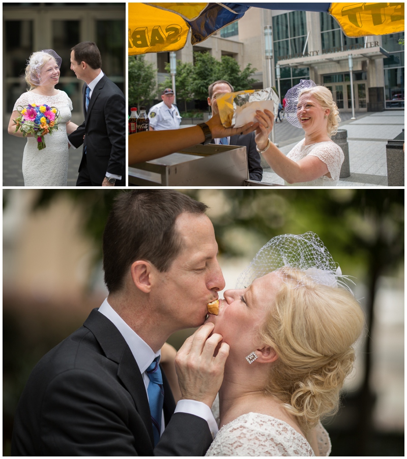 Amy: Walking down the street to the Courthouse dolled up with a photographer taking photos of it all. That was a processional. It was like all of Downtown Raleigh was there with us, wishing us well. Seeing our friends and family in the security line at the Courthouse: we had to be the happiest bunch ever to go through a metal detector. Putting Conan’s ring on the wrong hand. Our first meal as husband and wife: street vendor hotdogs. Best ending to a no-carb wedding diet ever! And my friend Matty’s speech at the reception was one of the most poignant, heartfelt impromptu speeches: I’ll never forget that.