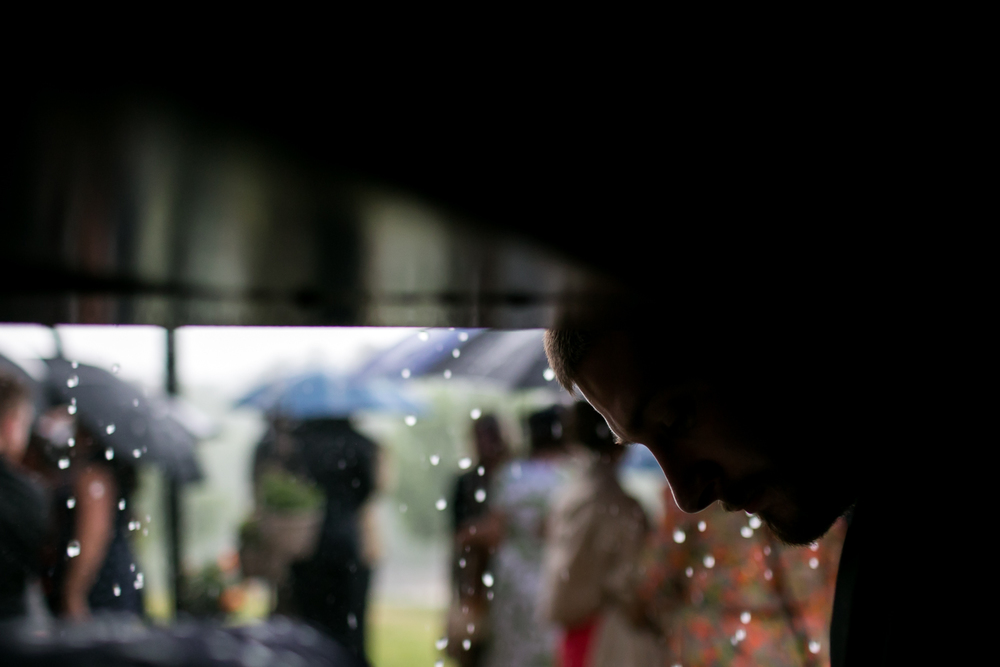 As I huddled with guests who were kind enough to invite me to stand under their umbrellas, I was happily reminded of my weather feature-hunting days as a photographer at The Naples Daily News. I admired everyone’s ease with the rain; instead of becoming frustrated about the weather, Ashton and Thomas laughed it off and waited out the storm, and their guests happily followed suite. Thirty minutes and dozens of epic rain-feature photos later, the groomsmen began wiping down the seats.