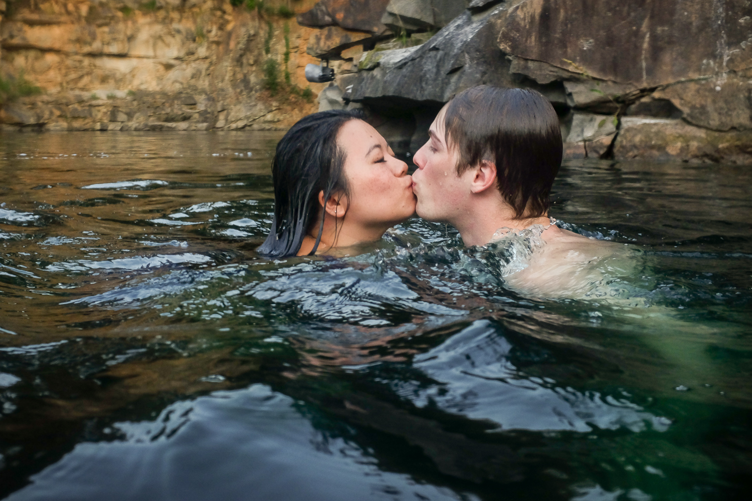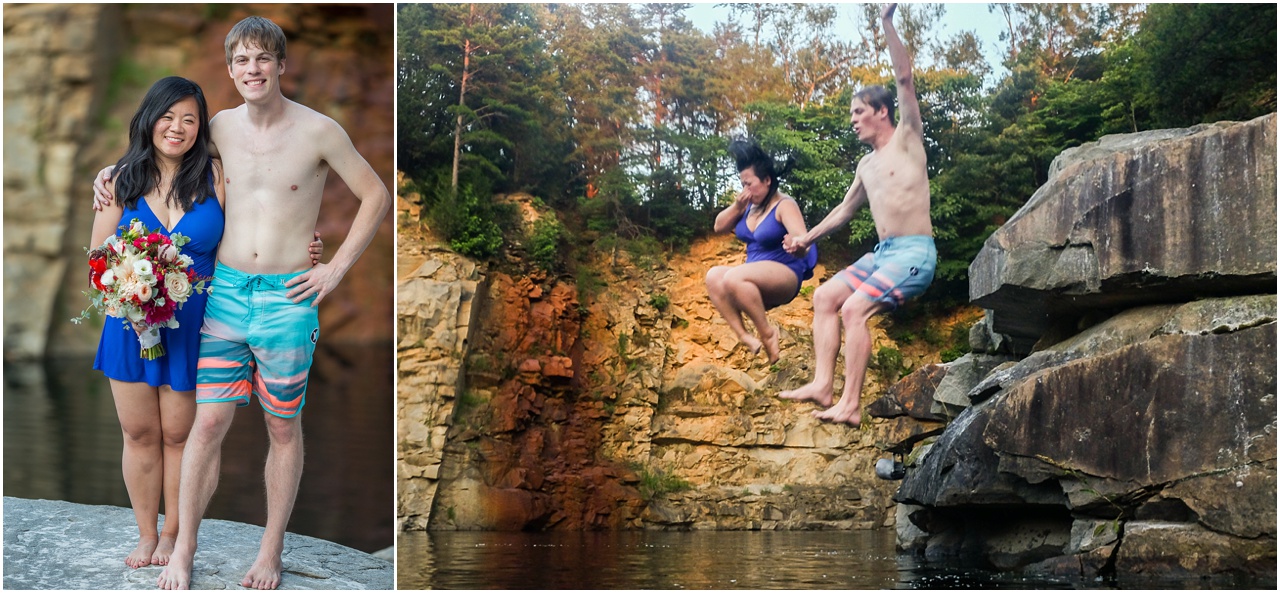 Here’s a behind-the-scenes look at a unique Rock Quarry wedding! Associate photographer Bri Brough and I LOVED Jenn + Kennedy’s idea of having a “first jump” into the quarry instead of a traditional first dance. We all put our heads together to figure out how to capture that unique moment in an unconventional way…and decided to rent underwater gear + flotation devices and get in the water. Here are some of the shots captured of that special moment! What do you think? (To view all the photos from this wedding and learn more about how we got these shots, visit the full blog gallery from Jennifer + Kennedy’s wedding!)