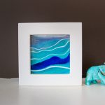 Do you love the mountains? The navy, teal, and white shades in this mini painting mimic a mountain overlook on a cool winter day. Fine white detailing gives the final piece a bit of mountain flair. Your 3×3 inch mini painting is made from acrylic and acrylic ink on canvas. It comes framed in a contemporary white wood gallery frame, ready to hang on your wall or display on your favorite bookshelf.