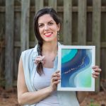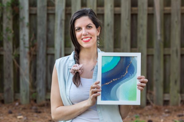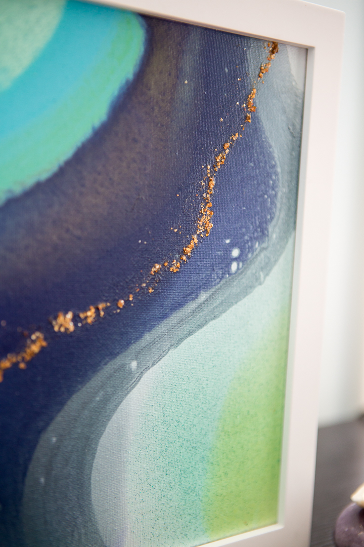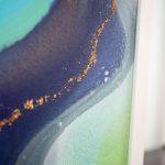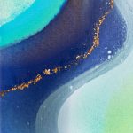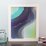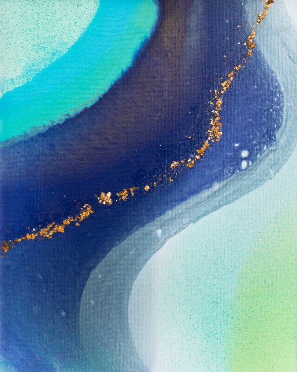 8×10 inch Acrylic, Acrylic Ink, and Mica Flakes on Canvas, Framed in a Contemporary White Wood Gallery Frame My intern Kat, who hails from Alaska, named this painting after the Kenai River, a little piece of home for her. The winding purples, soft greens, and icy blues feel like a wintry riverscape of The Last Frontier. “Seascape Kenai” is an 8×10 inch original fluid painting. This abstract painting combines acrylic, acrylic ink, glitter, and gold mica flakes on canvas. It comes framed and wired in a contemporary white wood gallery frame. For more detailed information on “Seascape Kenai,” scroll all…
