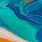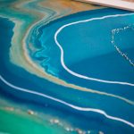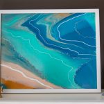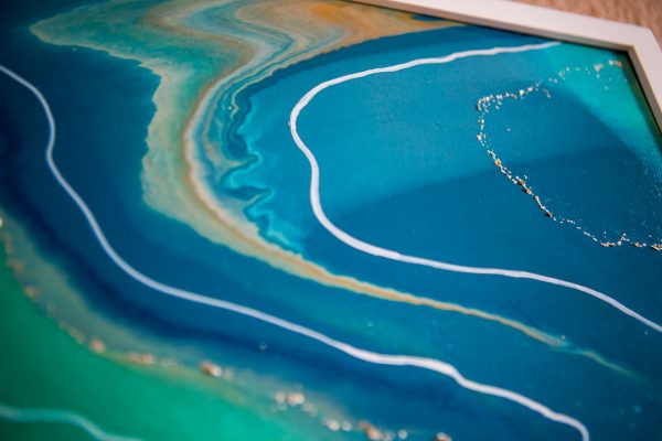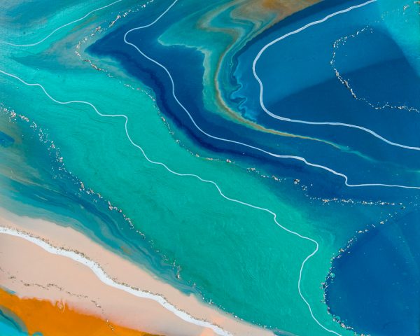 16×20 inch Acrylic, Acrylic Ink, Copper Powder, and Mica Flakes on Canvas, Framed in a Contemporary White Wood Gallery Frame Named after a beach in the Outer Banks that I love to visit, “Seascape Kitty Hawk” is inspired by the cotton-candy colors in its tourist shops. This fluid painting is a celebration of pastel green, peach, and blue. “Seascape Kitty Hawk ” is a 16×20 inch original fluid painting. This abstract painting combines acrylic, acrylic ink, copper powder, and gold mica flakes on canvas. It comes framed and wired in a contemporary white wood gallery frame. For more detailed information…