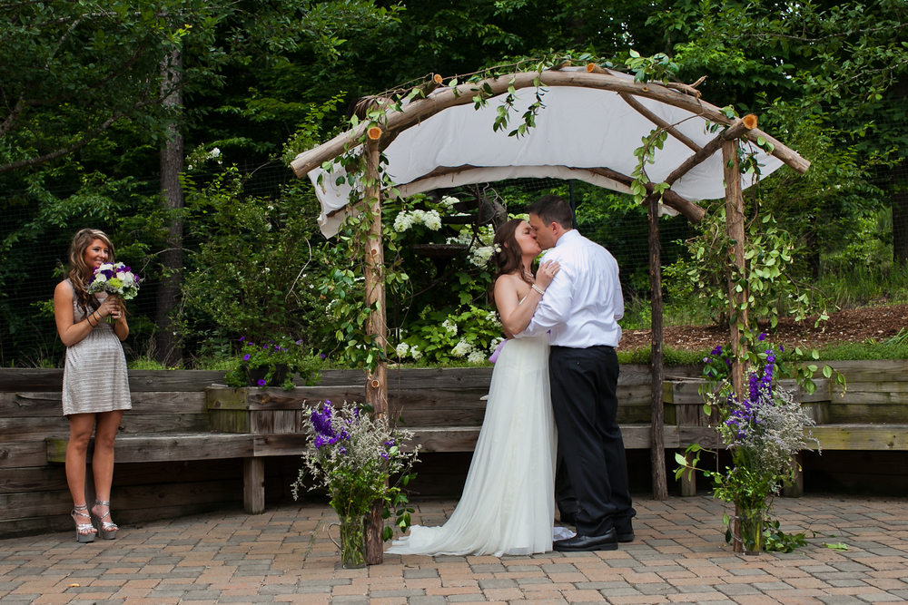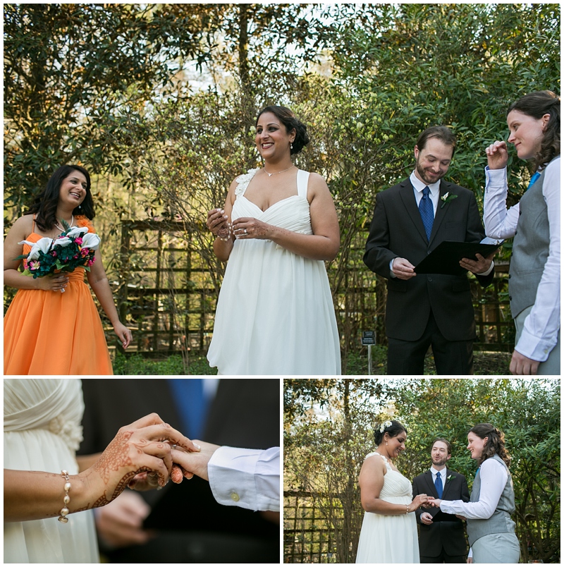 One of my favorite elements of Brittany and Bejal’s NC Botanical Garden ceremony was the layout of the space. Instead of walking down a center aisle, Brittany and Bejal processed together but on separate sides of the circular perimeter, around the guests instead of cutting through them.  I also loved that they did their first dance right after they said their vows and kissed instead of during the reception.