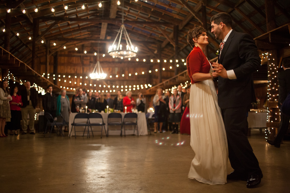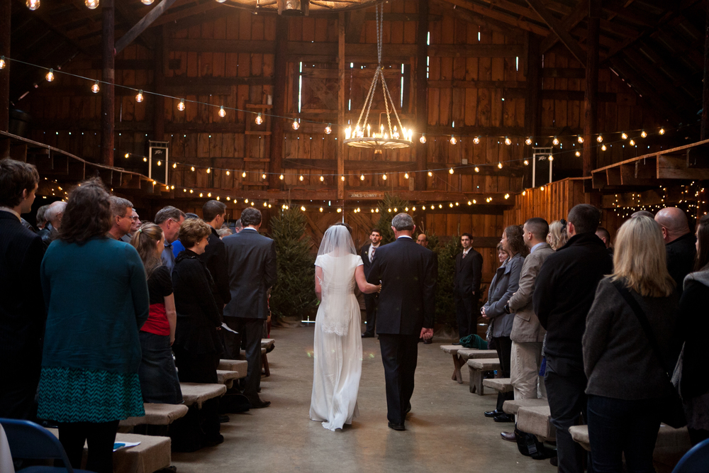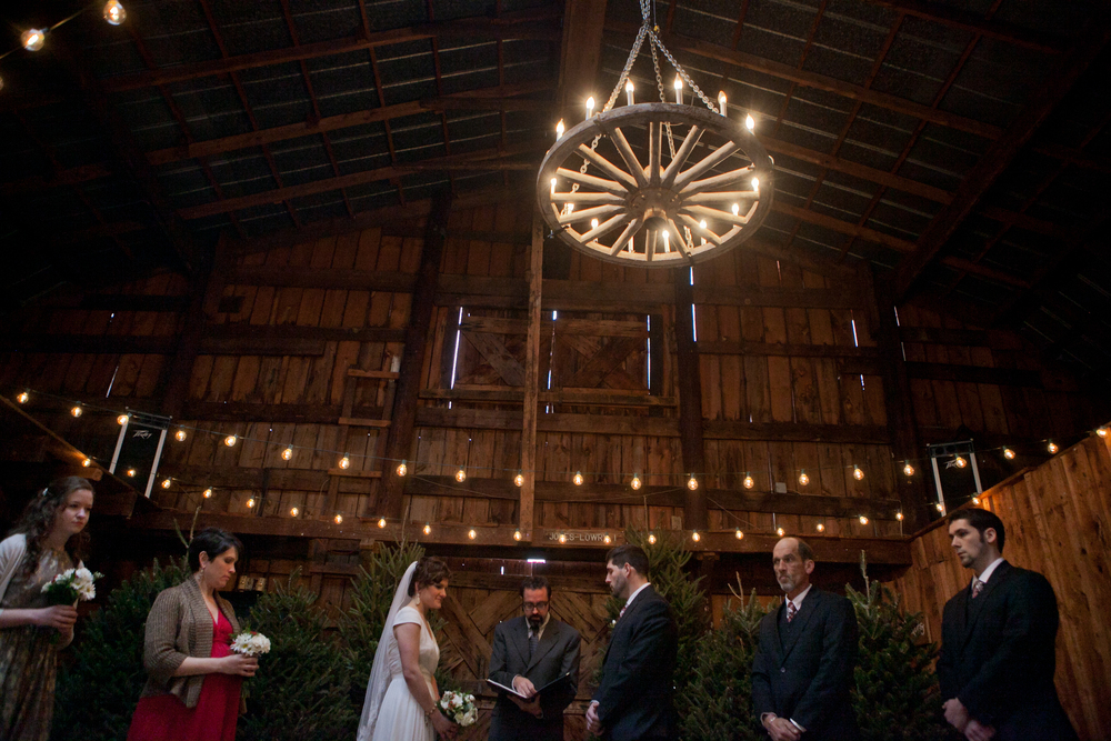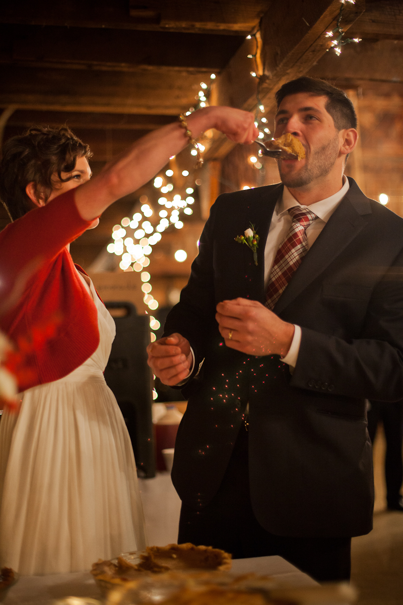 Lisette and Steven’s barn wedding turned out to be really beautiful.  Family and friends helped out with all aspects of the set-up, stringing Christmas lights around the perimeter of the inside and baking pies for their potluck-style dessert bar.  In an age when the wedding industry tries to convince couples to drop ridiculous amounts of money on mere table settings, it was really refreshing to experience an intimate, beautiful DIY wedding.