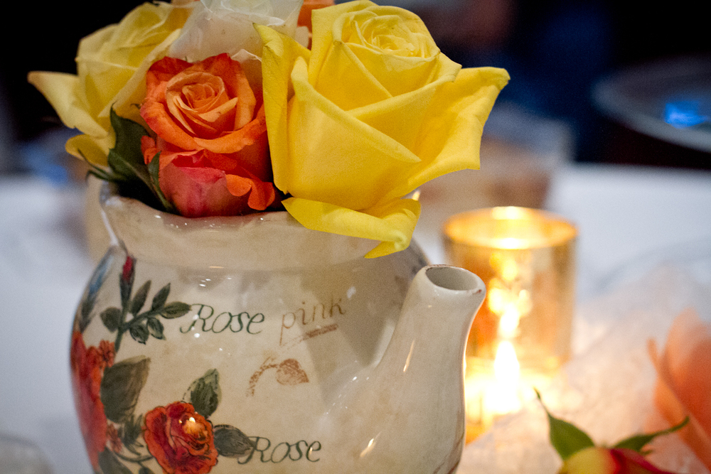 details at their reception:  elephant teapots, paper birds kissing on