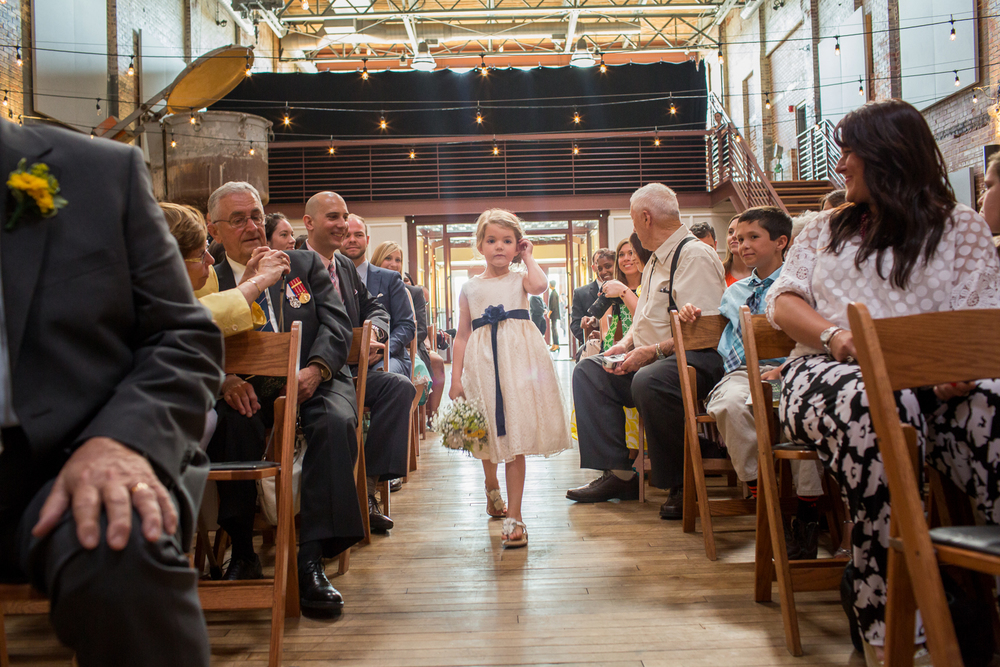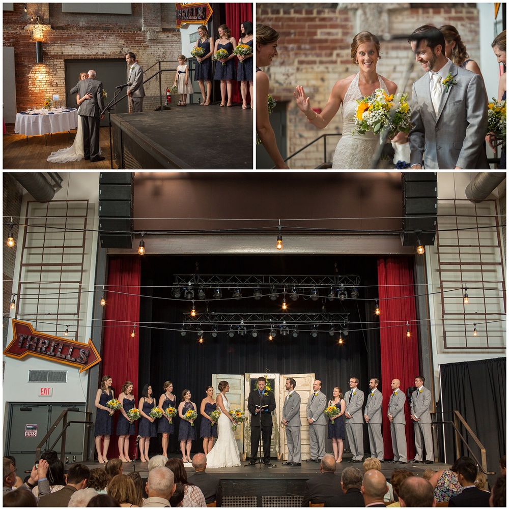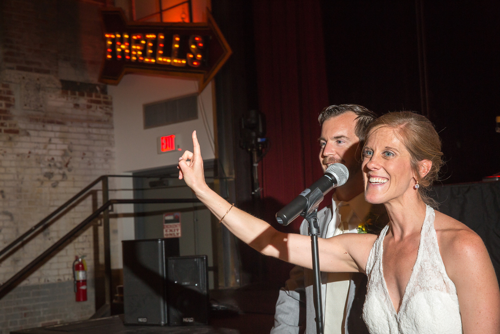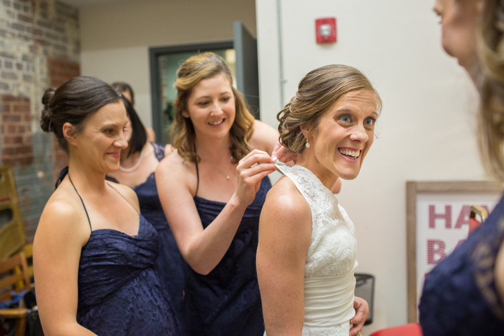 Katherine and Caley tied the knot at the Haw River Ballroom on March 9, 2014. This venue has been one of my favorites since I first discovered the hidden gem that is Saxapahaw back in 2009. The ballroom boasts tons of natural light, a rustic wall in the outdoor amphitheater that is the perfect backdrop for portraits, and the classic “thrills” sign that lights up near the stage. In other words, it’s a photographer’s playground. And we had perfect spring weather (unlike the sub-zero chill during our engagement session there back in January!)