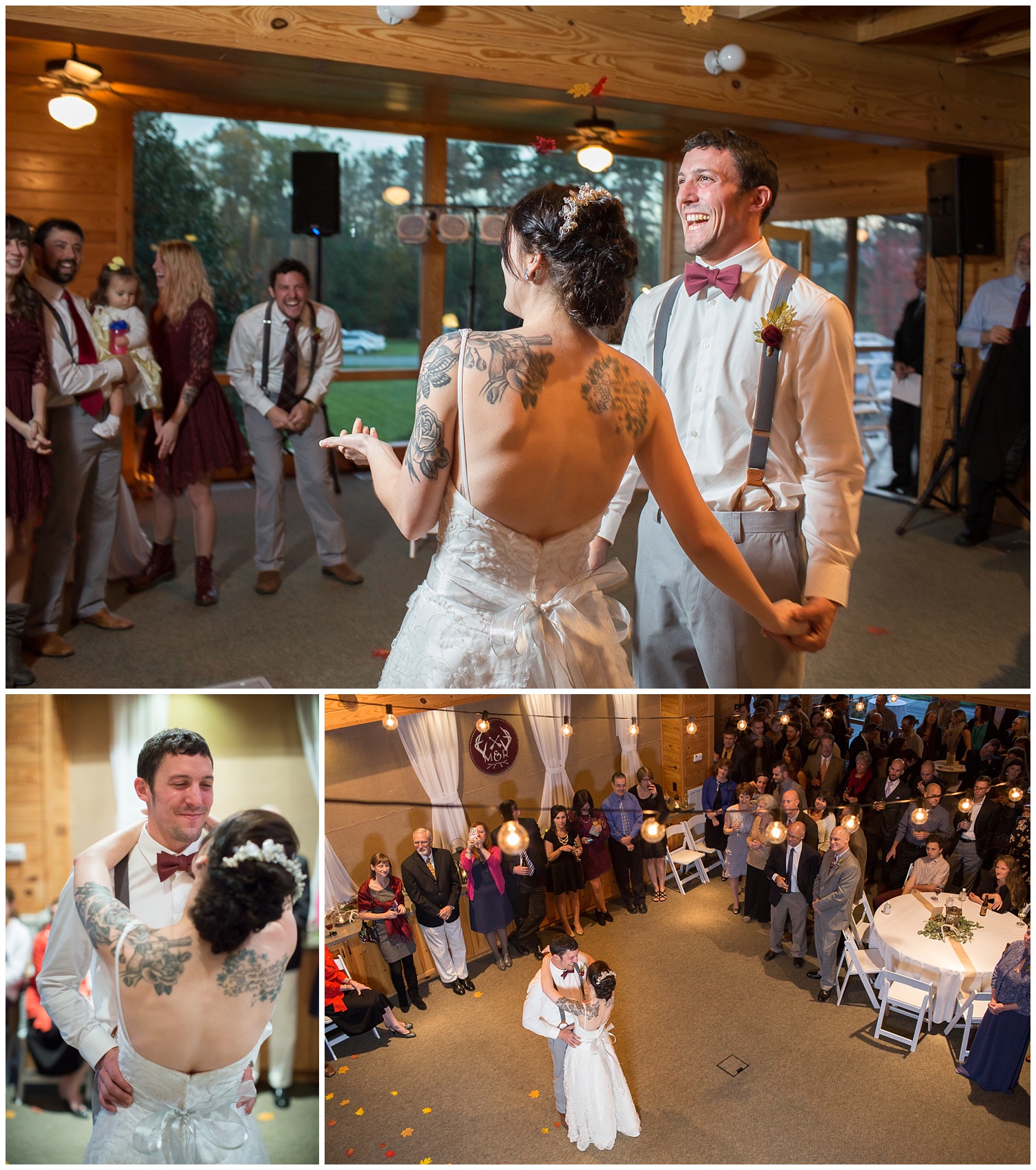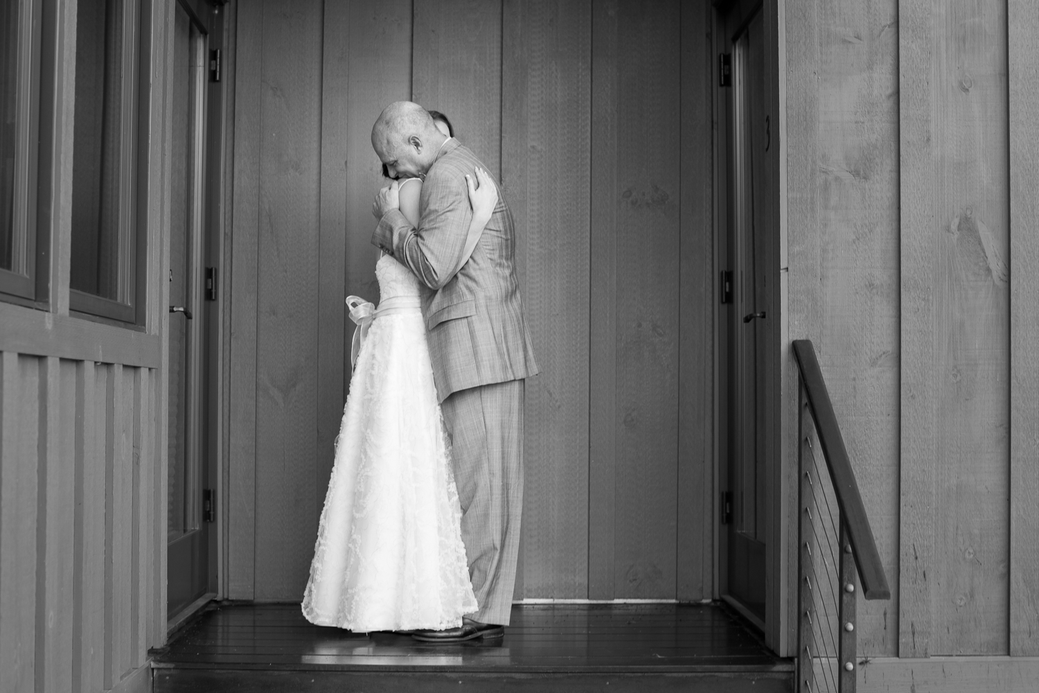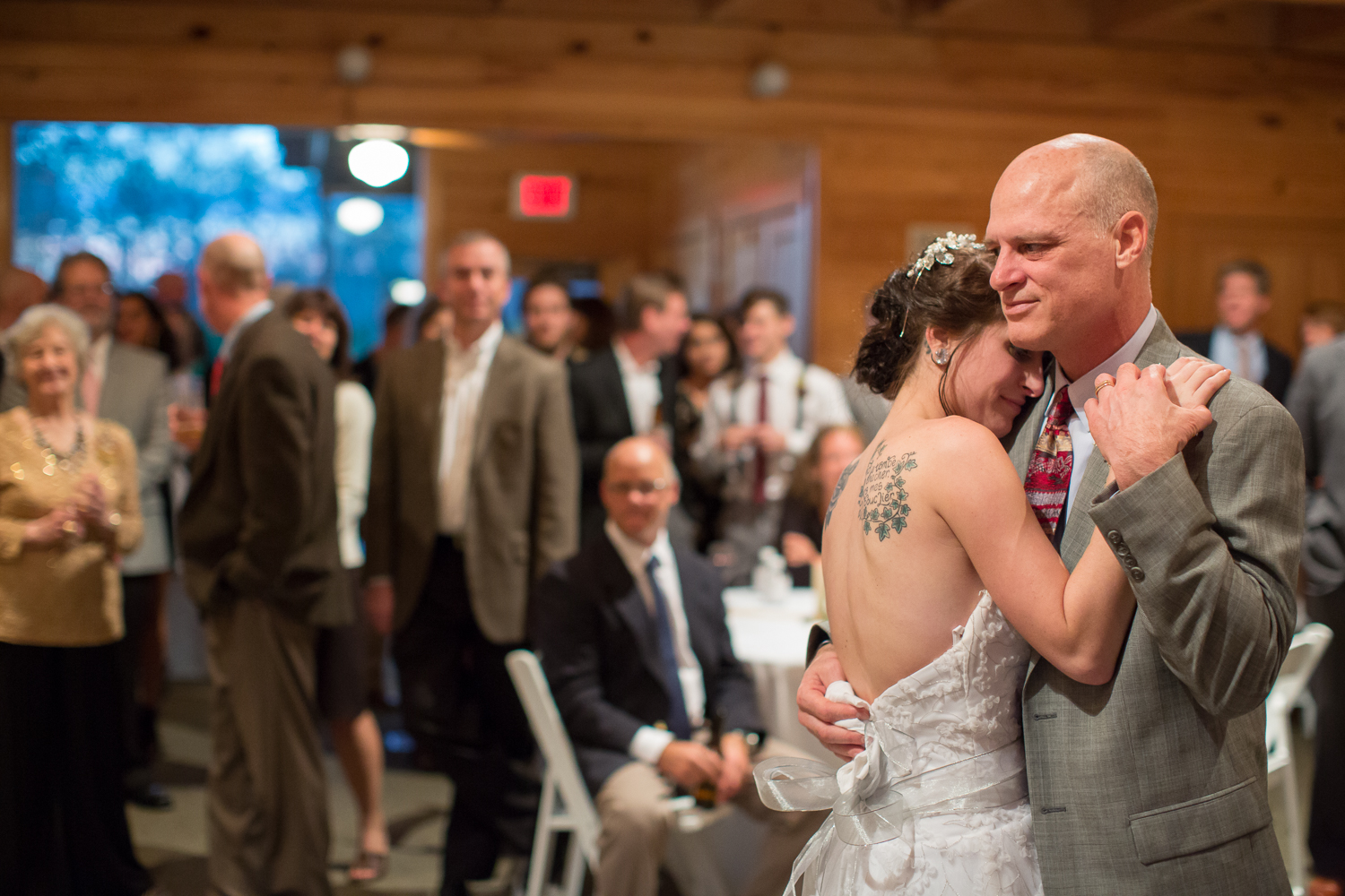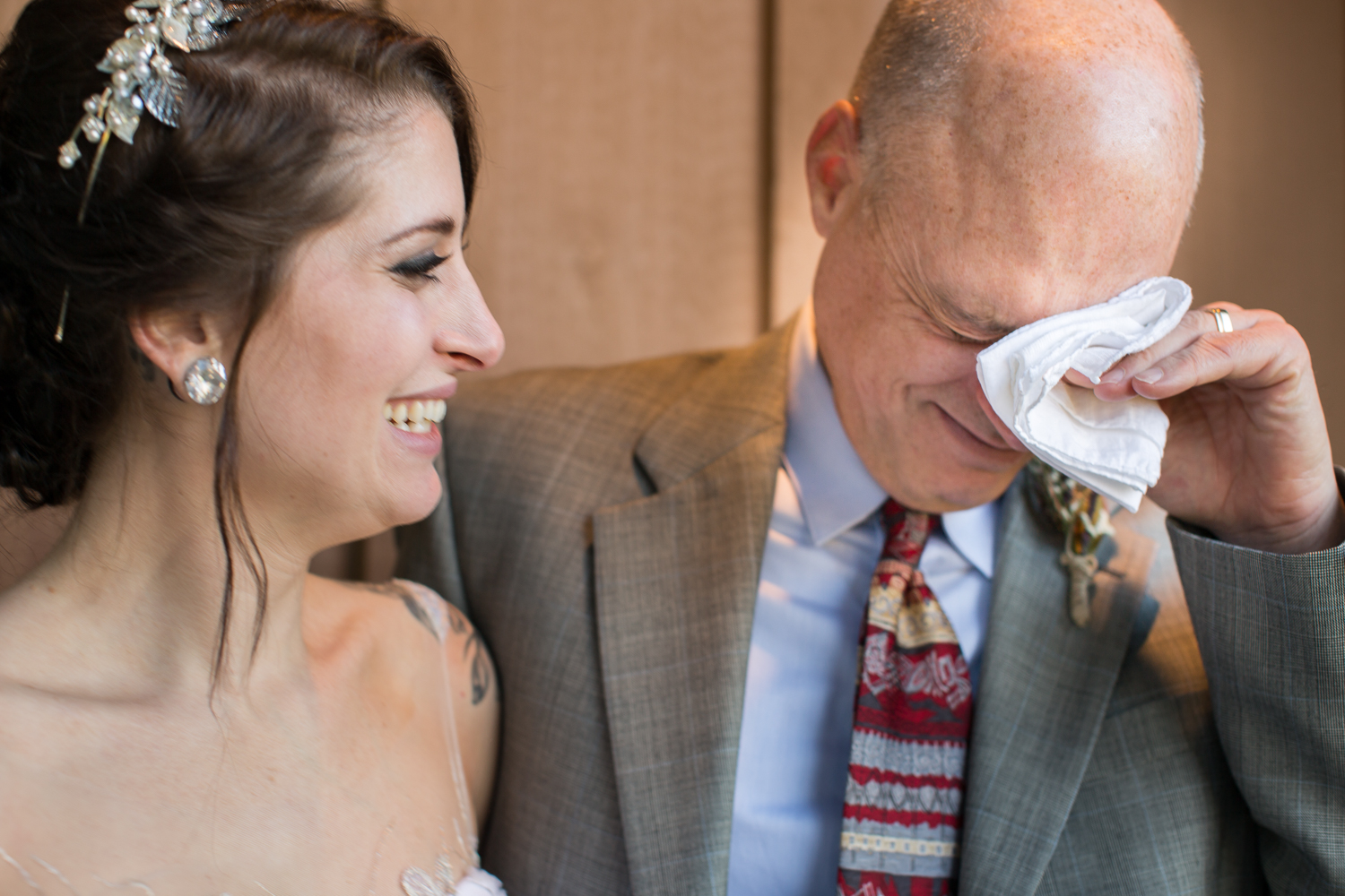 There were a lot of silly moments during our day.  We think that it is a toss up between all of our friends doing keg stands, my uncle wearing a tie on his head like Quail Man, and my escape outfit… A star wars onesie. My father and I also had a few funny moments. As we were walking out of the room hand in hand to walk down the aisle I realized I didn’t have my bouquet. I started panicking and we both stopped mid walk, turned around, and ran back to the room giggling like mad men. While he was giving me to Robbie he kissed me on the cheek, and then he had to make a joke and give Robbie and big ol’ smack on the face as well. Some of the sweetest moments included my father and my dance where we had to share a handkerchief.  He is the toughest man I know and this is the first time I have seen him openly cry multiple times in one day. I can’t forget the look on Robbie’s face as I walked down the aisle. He is so much like my father, and to see him tear up and smile at me with that big beautiful smile made my heart melt.
